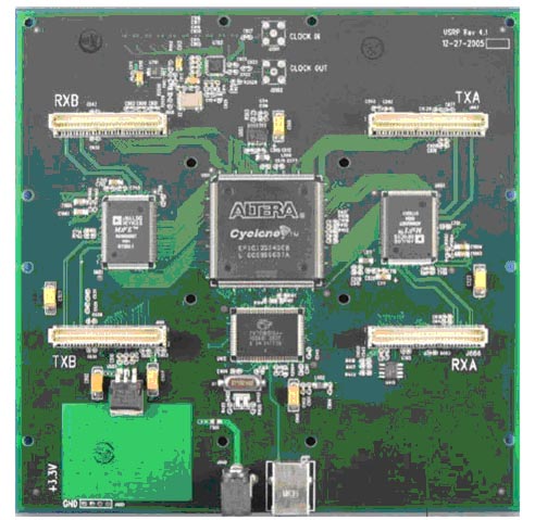 USRP有4个高速模拟数字转换器(ADCs),每符号12 比特,64M 符号/秒。另有4个高速数字模拟转换器(DACs),每符号14 比特,128M 符号/秒。这4个输入和输出通道连接到Altera的 Cyclone EP1C12 FPGA 上。FPGA进而连接到USB2 接口芯片Cypress FX2,并接至计算机上。USRP 只通过高速USB2.0 接口连接到计算机,不能使用USB1.1。因此,原则上,如果使用实采样的话,有4个输入和4个输出通道。但是如果使用复采样(IQ),可以有更大的灵活性(和带宽)。此时必须对它们进行配对,这样就能获得2 个复输入和2个复输出。